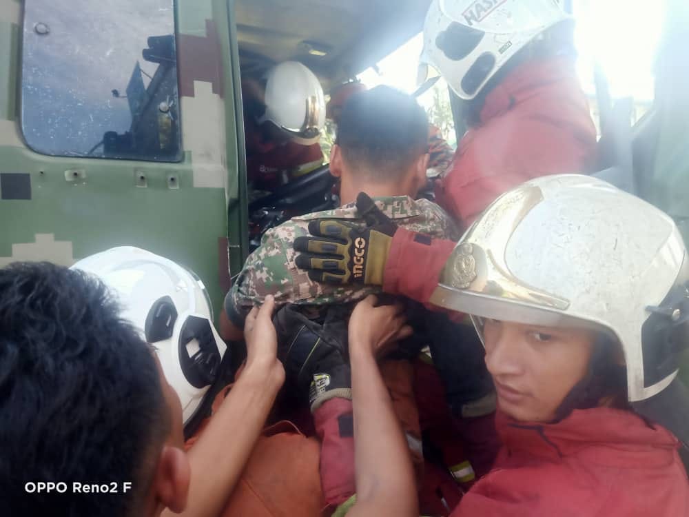 “Seorang lelaki berusia lingkungan 20an iaitu anggota Tentera Darat didapati telah tersepit di bahagian kaki.