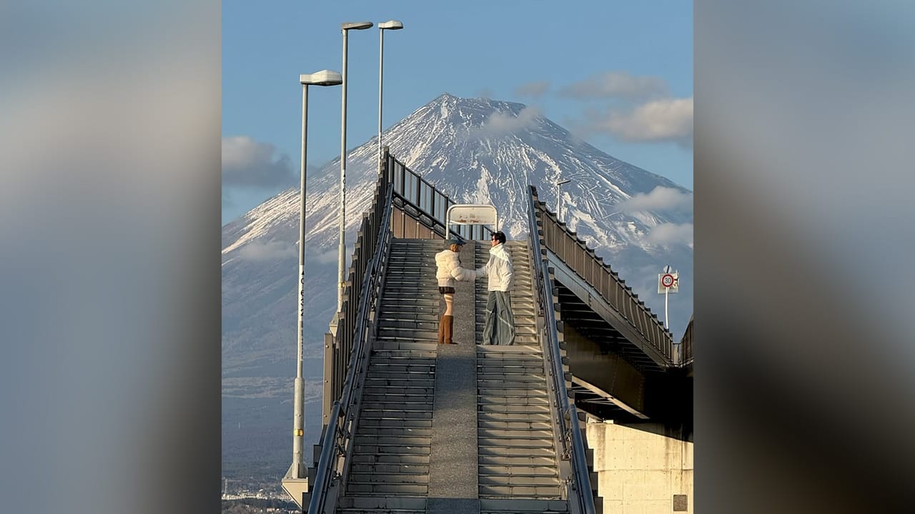 Semasa hari cuaca baik pada April lepas, lebih 50 orang beratur untuk mengambil gambar di sebuah tangga yang tular kerana kelihatan seolah-olah menghala terus ke Gunung Fuji setinggi 3,776 meter, gunung tertinggi di Jepun.