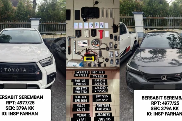 Semasa Polis tumpas kumpulan curi kenderaan mewah di beberapa negeri Editorial ND11 months ago11 months ago03 mins SEREMBAN – Dua suspek masing-masing memiliki 61 dan 77 rekod jenayah termasuk menjadi buruan kes…